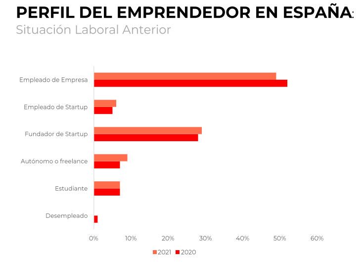 Según los datos recogidos de El mapa del emprendimiento 2021, el perfil del emprendedor en España es el de persona joven, con una edad media entre los 25 y los 34 años, en su mayoría hombre (80%) y con experiencia previa en haber participado alguna vez en la creación de una startup (58%).